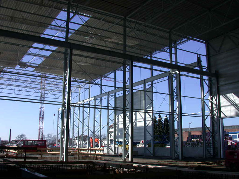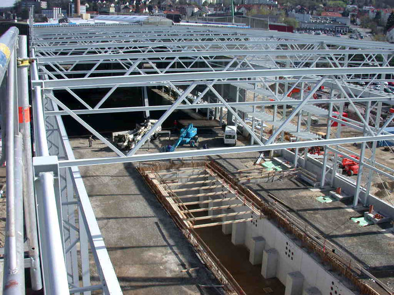 Stahlrahmenkonstruktion aus Fachwerkriegeln und -stielen; Brückenkrane mit bis zu 63 t Traglast