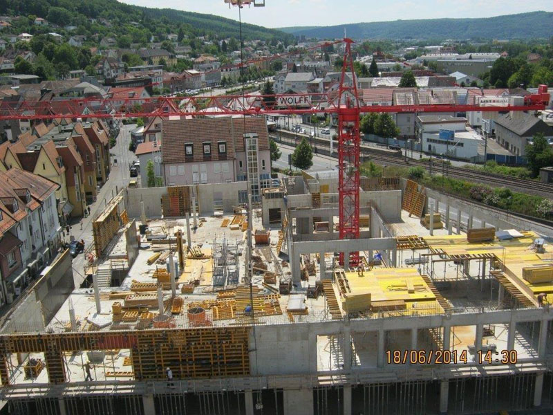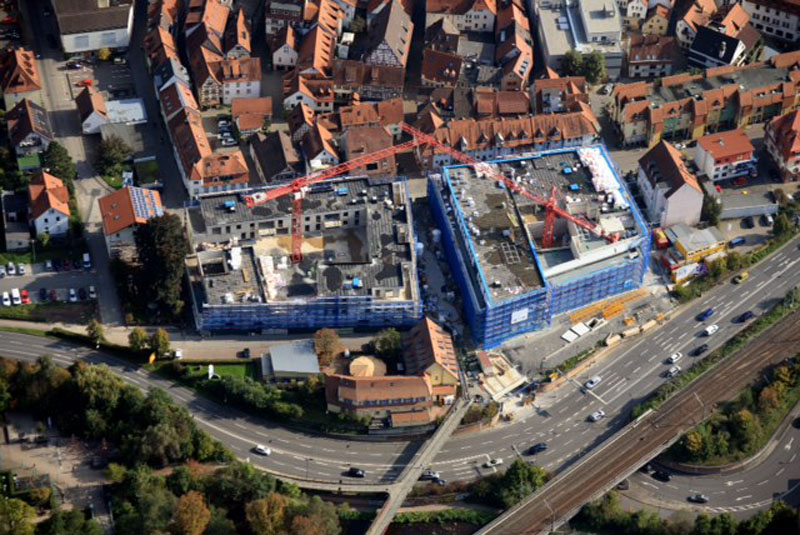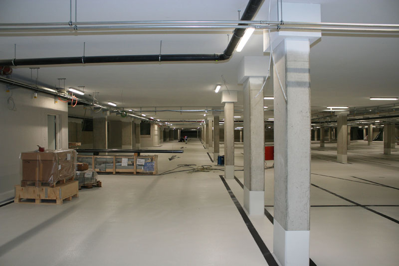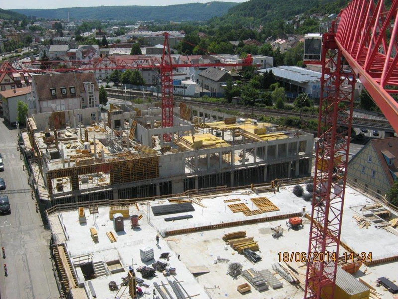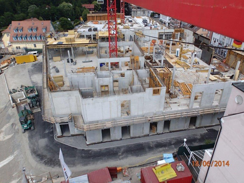 Tiefgarage ca. 6500 m² GR, WU-Konstruktion EG bis 2. OG Geschäftsräume und Wohnungen, ca. 12000 m² GF, Ortbetonkonstruktion mit Flachdecken